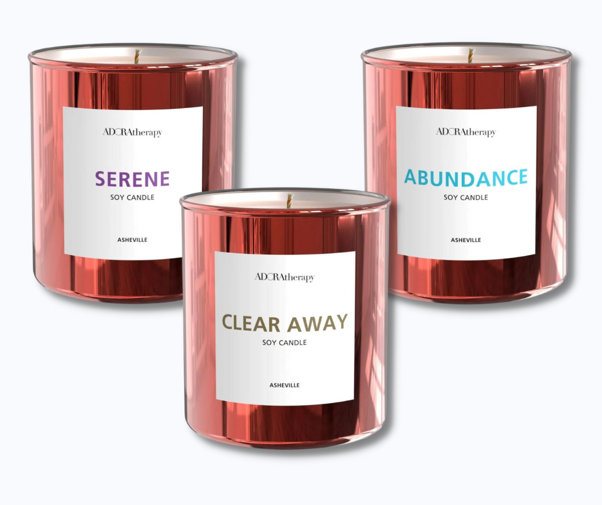 Asheville company Adoratherapy. The company offers a unique blend of beauty, fragrance, and candles which are sold nationally. Located in The Grove location, they also offer Auratherapy readings to their customers. Plus, they are excited to share this brand *NEW* candle collection from ADORAtherapy.