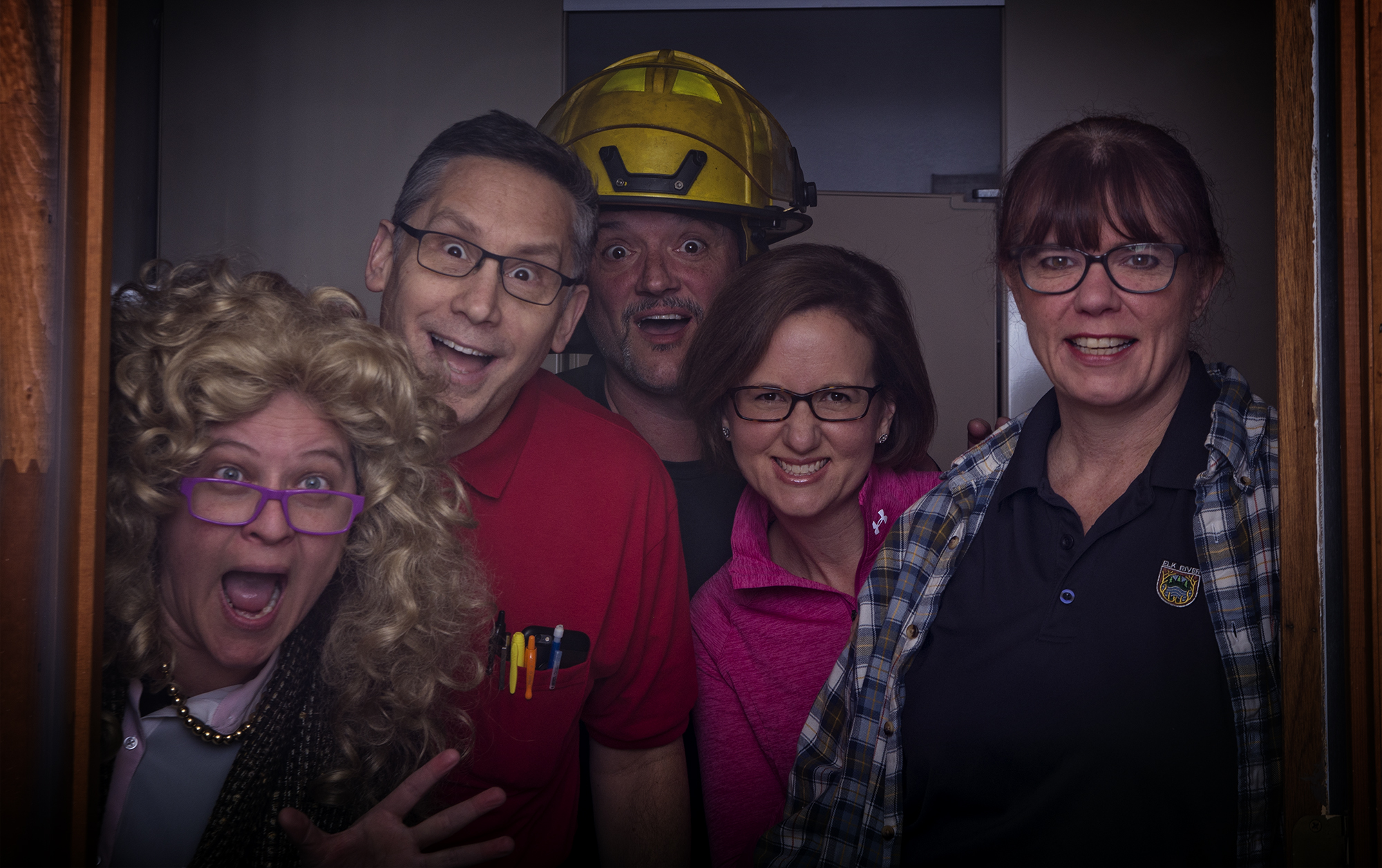 The play begins just after Donald Trump’s 2016 presidential election victory, when a group of five Ashevillians (all but one of whom are Hillary supporters and Asheville natives) form a secret committee to monitor the hate crimes they believe Trump’s election will unleash. Each member is uniquely positioned to hear vast cross-sections of local scuttlebutt. They zanily range from Andrea Caldwell, a lesbian police dispatcher to Johnson Hendon III, a Verizon phone manager—neither of whom is above bending privacy laws; from Lizzie Crutchfield, a doctor’s wife gaga for gossip and animal rights, to Olson Kelly, who is a politically fence-sitting firefighter and who has “only” lived in Asheville since he was two. This cabal is presided over by DSS receptionist Velma Lytle who is traditionally religious and has a Southern brogue that turns even single words into audience laughter.