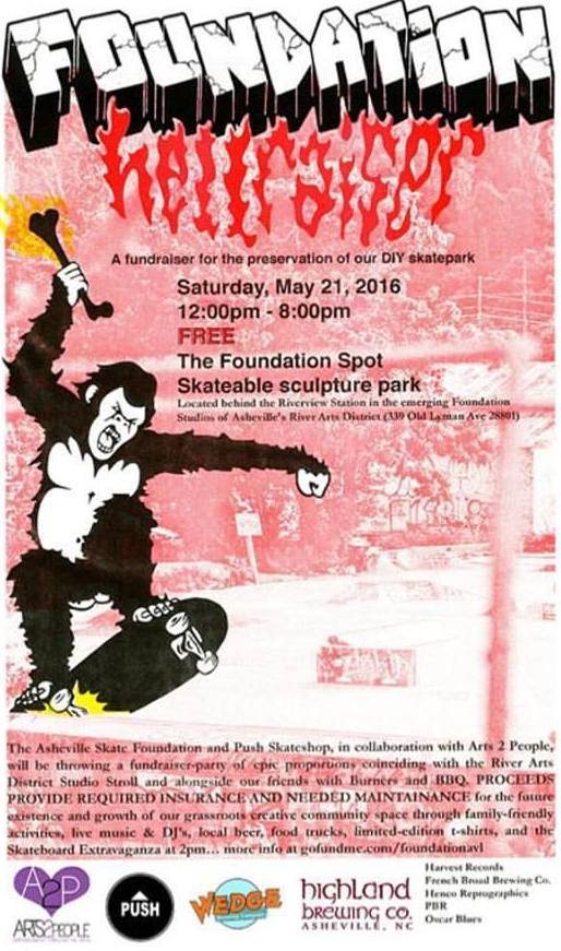 PUSH Skate Shop, was part of that city-wide debate to legalize skating in downtown Asheville and has played an instrumental role in rallying the troops to develop RAD’s skate-space, The Foundation. With the help of Arts2People, they’re inviting the public out this Saturday, May 21st to check it out, grab a cold beer and listen to live music as part of their fundraiser, which they’ve aptly re-dubbed their Hellraiser. “I think