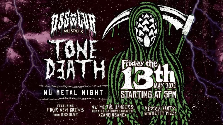 Join us for “TONE DEATH” An ear splitting evening of Nu Metal BANGERS and hallowed beer releases at DSSOLVR on May 13th.