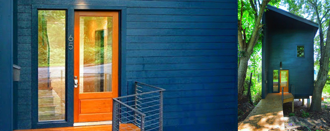 The Blue House in Five Points is up for the George Matsumoto Prize from North Carolina Modernist Houses. With the recent additions of Trader Joes and Harris Teeter off of Merrimon Avenue, the burgeoning and highly walk-able Five Points neighborhood has become home to new infill construction including to this simple and clever home by a couple of my favorite architects Maria Rosafova and Jakub Markulis of Rusafova Markulis Architects. The Blue House was designed for a young family that wanted a small, energy efficient and affordable house to call home. Their building site presented the architect with numerous challenges and site constraints. An existing sewer easement cut diagonally through the site, leaving a small trapezoidal area to build on. In order to maximize the square footage they designed a vertical, tree house structure elevated from the ground in order to not disturb the roots of the two mature trees that they wanted to preseBlue House Comprve. Inspired by Japanese aesthetics, the clients opted for clean lines, simple yet visually striking shapes and open floor plan that provides visual continuity between inside and outside. The modest construction budget dictated the off-the-shelf choice of materials. The architects kept a simple palette of finishes adding visual interest through the use of bold colors and warm plywood walls. If you would like to see the other homes in the competition and vote click here.