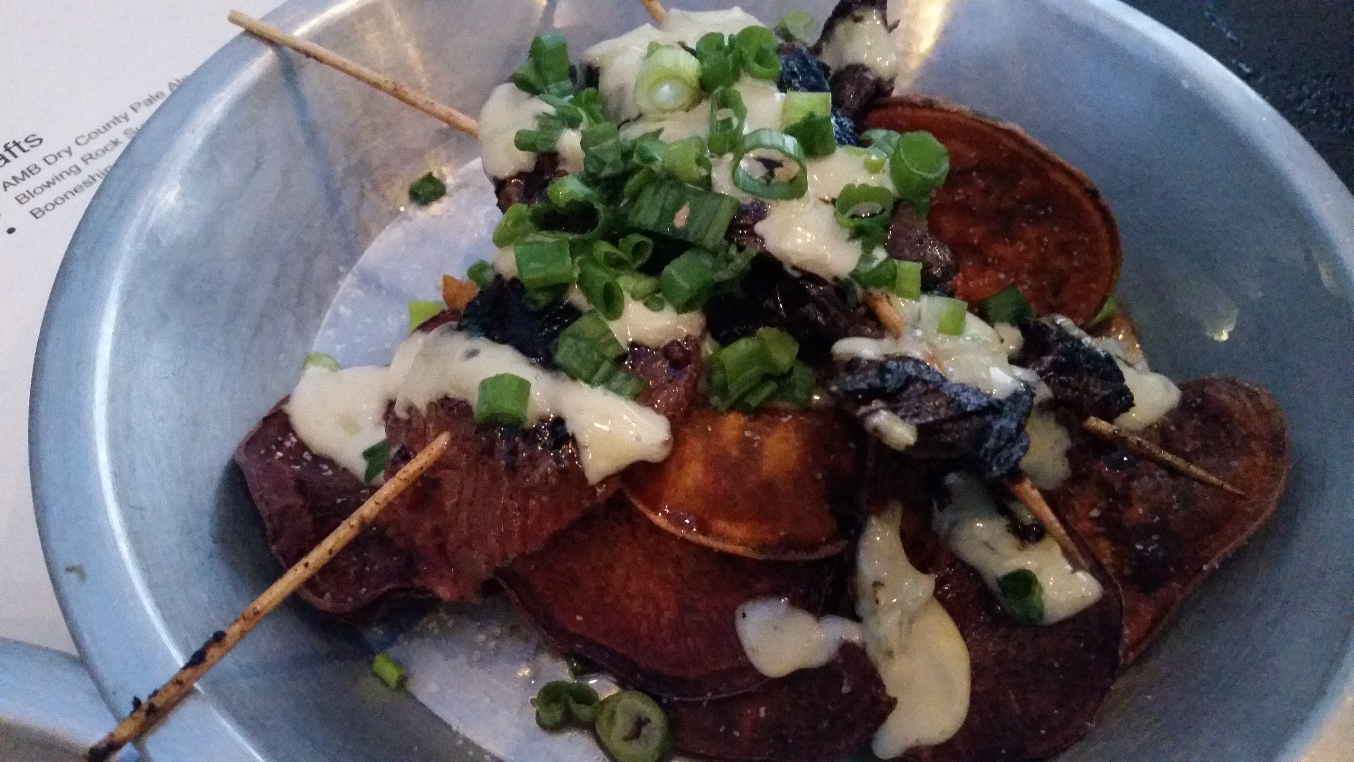 Next up: beef tataki. Skewers of medium-rare hanger steak fresh off the grill were accompanied by the southern touch of crispy sweet potato chips and scallion aioli. After that was a dish of blistered shishito peppers sprinkled with salt and tossed in a citrus kewpie mayonnaise. Shishitos are a favorite of mine, and Gaijin executed them perfectly by leaving them unadorned besides the light sauce.