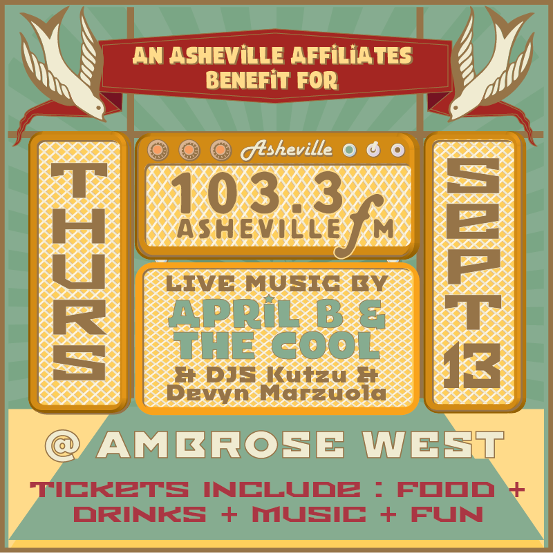 For nearly 20 years, community network group the Asheville Affiliates have been celebrating and raising funds for local non-profits through hosting signature "Parties with a Purpose". The beneficiary of their latest bash will be our favorite community radio station 103.3 Asheville FM celebrating its 9th year in the ears of Asheville. Happy Birthday, Asheville FM! The party goes down on Thursday, September 13th from 6-9pm at Ambrose West where your $25 ticket gets you food, drinks, and fabulous live music. April B. & The Cool (check them out below) are the headliners along with Asheville's own DJ's Kudzu and Devyn Marzoula from The Double Crown .       Asheville FM is a volunteer-based, grassroots community radio station. We want to hear music, news, and the unusual all produced right here in our neck of the woods. We want to hear sounds from around the world, discerned and distilled just for us by our neighbors. We want to help make connections between diverse groups and support the local economy of ideas. ____________________ Founded in 1999, The Asheville Affiliates is a community network that hosts "Parties with a Purpose" to support Asheville area non-profit organizations. Over the last 19 years they have helped over 50 non-profits raise over $500,000.