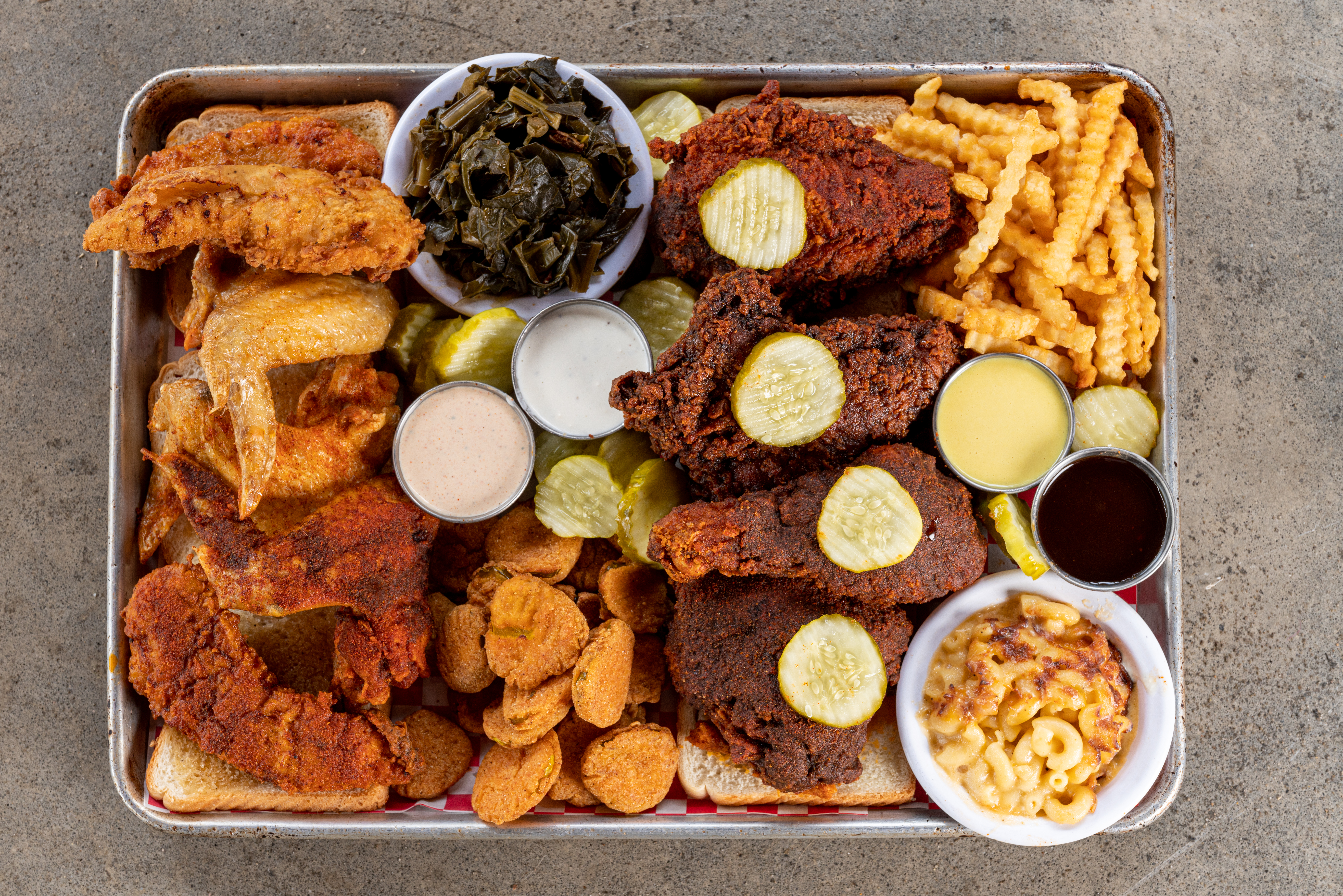 Lauren Cundiff: “We both worked for Whole Foods Market when they were just getting started. We moved to Asheville from the west coast when Rich was offered a position with Earth Fare. His office was near the original Rocky’s Hot Chicken Shack on Hendersonville Road. Back then Rocky Lindsley was the sole proprietor. He was a one man show who did everything from taking orders to preparing plates. It was a day hobby for him. He was also a professional musician who mostly played gigs at night. He had spent time in Nashville, and was a regular at Prince’s Hot Chicken Shack. He figured out his own hot chicken recipe and put up his shingle in Asheville. Rich and Rocky became friends and Rich often advised him on business matters since it wasn’t Rocky’s forte. After about a year, Rocky’s closed, citing that it was more than he could handle. A grass roots upheaval started in Asheville to bring back the hot chicken as it had become very popular. Rich and I believed so strongly in the concept that we agreed to partner with Rocky to find a new location and relaunch the restaurant. Rocky brought the recipe, Rich had the business sense, and I had a commercial design background. So in June 2011 our combined efforts launched the new location in West Asheville with an expanded menu and hours. We were busy from the moment we opened. Rocky stayed for a year before deciding to pursue his true passion, music, full time. We broke our partnership but remained friends. Rich and I continue to operate the business. Sadly, Rocky passed away in 2020.”