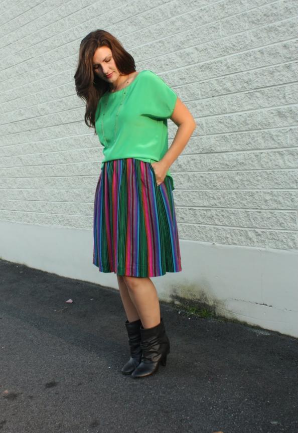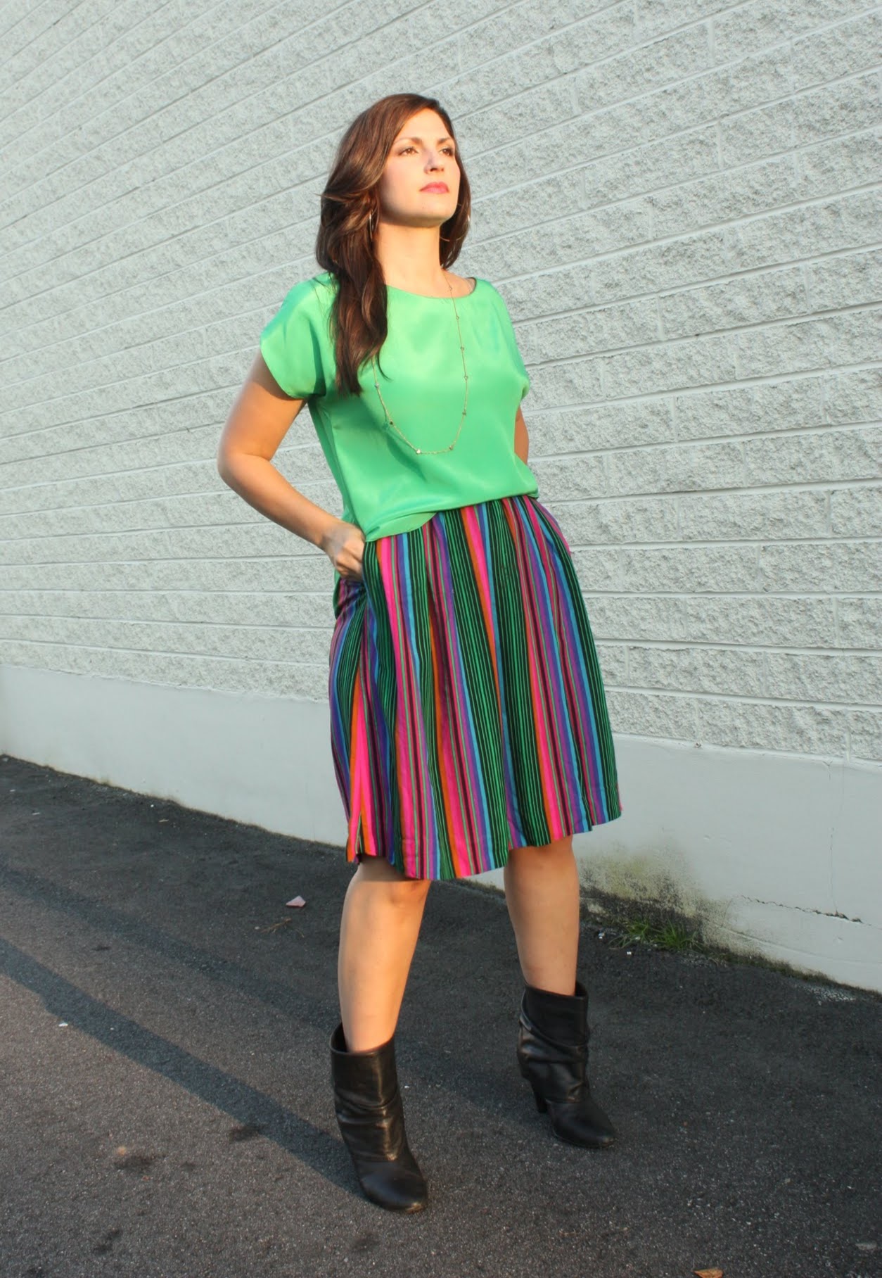 More often than not I find myself reaching for the gray and the black items from my closet as the weather turns cooler and the winter starts flexing it's muscles. The moodier color palette is comfortable and it fits the colors of the skies, the bare tree limbs and my mood. I purposefully keep some of my summer items in my closet for changing season so that I can surprise even myself with a pop of color. Lighter tops and colorful skirts can stay in your closet year round. Just layer on top of them or underneath them as the weather gets cooler. This particular outfit will transition well with a pair of tights and a denim jacket. Right now since it is still warm in the afternoons I just pair it with a boot to signify summer is gone but not forgotten!