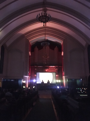 Visible Cloaks perform at First Presbyterian Church. (It's surreal to be able to drive between events and have plentiful parking) This show was really lovely and special. Doran and Carlile took full advantage of the sacred space, filling it with video, sound and coordinated lights. They also started punctually on time, which this reporter and his brother greatly appreciated.