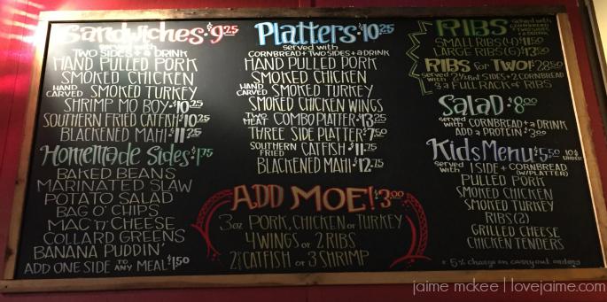 Moe's Original Bar B Que - until November when my husband and I had the pleasure of eating there one Friday night. We managed to try nearly everything on the menu (how often do you get the chance to say that?) and thoroughly enjoyed ourselves. I even tried everything knowing I wasn't going to be able to finish it all (that's just what pregnancy does to me. I'm no longer a bottomless pit for food.)