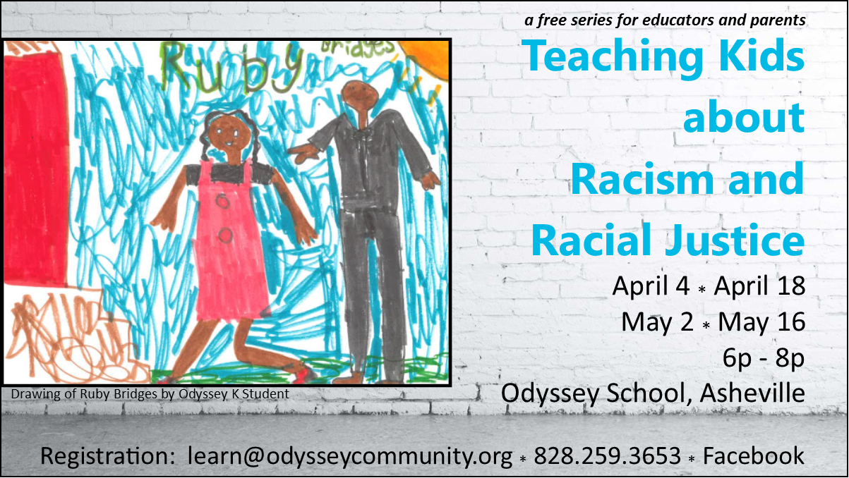 Teaching Kids about Racism & Racial Justice will be held at the Odyssey School on April 4th and 18th, May 2nd and 16th from 6PM to 8PM. Organizers request pre-registration: complete it