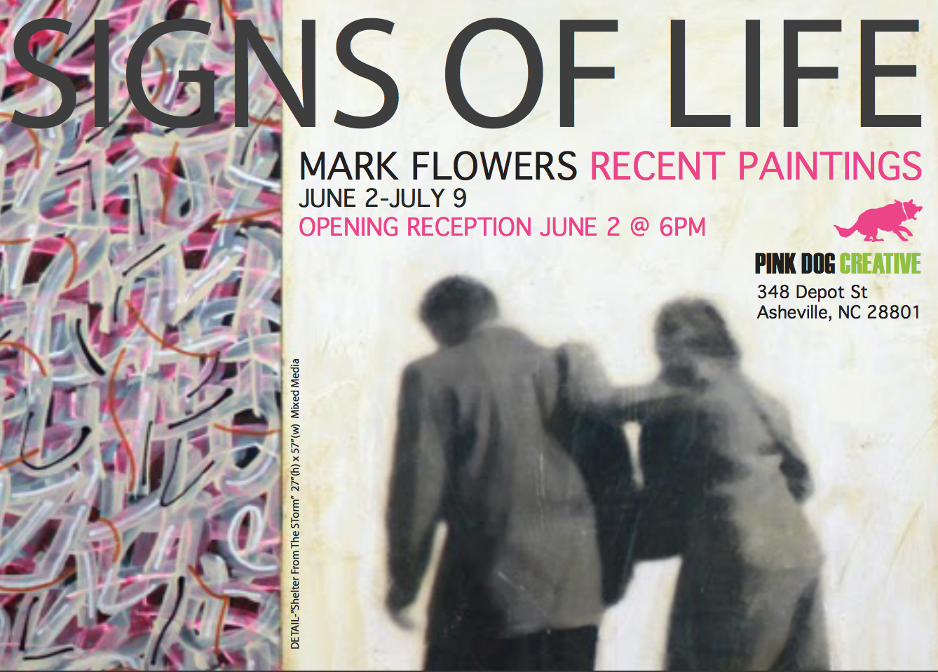 The Pink Dog Creative Gallery, 348 Depot St, Asheville, NC, June 2 through July 9. The opening celebration for “Signs of Life” is June 2 @ 6PM. Please join me.