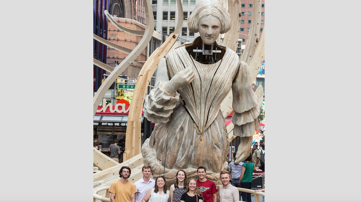 Photo: UNC Asheville students and graduates pose in front of "Wake" at the sculptural installation's opening in Times Square. From left to right: Jeb Hedgecock, Kyle Ward, Kaitlyn Thomas, Brittany Hand, Zoe Rorvig, Jacob Fink, and Elijah Nonamaker.