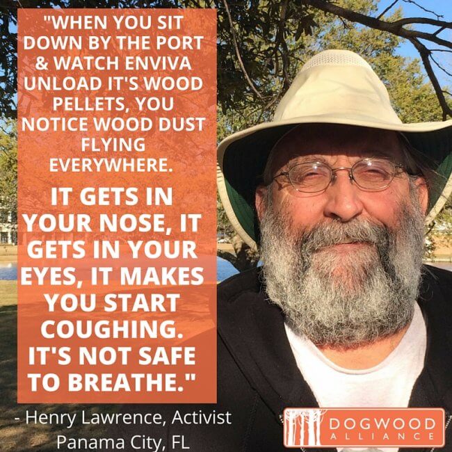 Henry Lawrence, a Southerner who lives near Enviva’s Panama City export city told us, “When you sit down by the port and watch Enviva load its wood pellets, you notice wood dust flying everywhere. It gets in your nose, it gets in your eyes, it makes you start coughing. It’s not safe to breathe.”