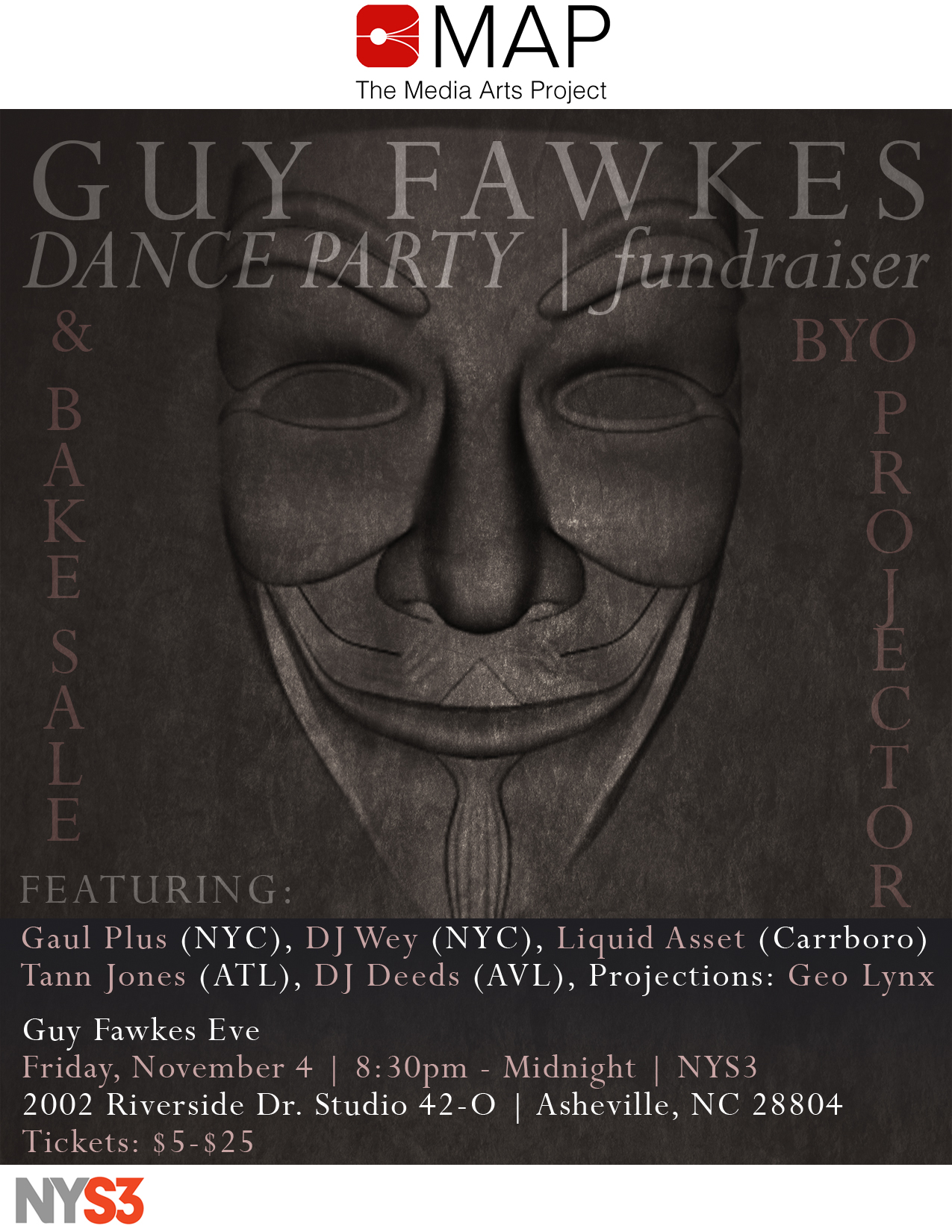 On Friday, 11/4, a dance party to benefit the Media Arts Project (MAP) will be held at the NYS3 Acting School warehouse space starting at 8:30 until midnight. The evening will celebrate arts and music through original DJ sets and live visual projections. Proceeds will go straight to the MAP, which will use the funds to support artists working in digital art, sound, installation, and performance. Acoustics will be optimal for this warehouse party on Riverside Dr. Producers and DJs Gaul Plus and DJ Wey (electronic deep house) will make their way from NYC, and will be accompanied by Carrboro's Liquid Asset (noisy acid and electro), Atlanta's Tann Jones (analog modular synths), Asheville's DJ Deeds (ambient house and techno), and more. Geo Lynx, who has has participated in the {Re}happening and in the 2016 Interlude, will do video projection. Guests are also encouraged to bring their own projectors and to create and share their own graphics. Not only will this be the weekend's best dance party, it's also going to be a bake sale. According to the MAP's press release, "The MAP is elevating the oldest form of fundraising to a new level and we hope you'll contribute to this unique event. Bring your baked item(s) to the Guy Fawkes Dance Party to be sold off with proceeds going to MAP's 2017 programming. Baked goods with a media theme and/or technological component will be automatically entered into a contest to win special honors and awards. Items should be edible, but if they're too beautiful to be eaten that's fine too." Suggested baked good themes include TV shows, LED lights, memes, glitch, science, gadgets, and just about anything else you can think of related to technology and media.  One upcoming MAP project is Frame+Form, Asheville's first Screen Dance Festival (March 2017), organized by MAP Board Chair Constance Humphries and board member Sara Baird, which will highlight the intersections between choreography, media arts, performance, and cinema. A donation of $5-$25 is suggested for the evening. Food and drink will be available for a donation. If you can't make it to the event, consider donating to the MAP through their website. Check out the Facebook event page here.