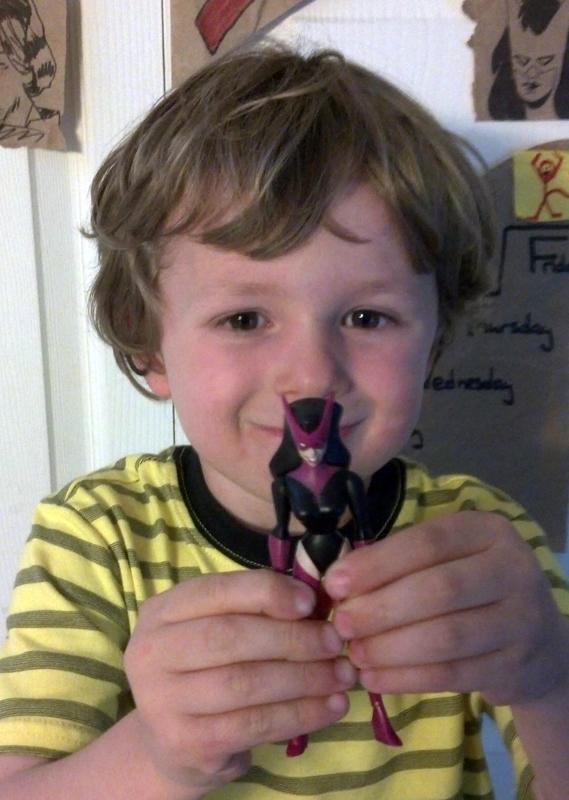 I can’t remember if it was me or the The Countess who thought up the monkey stairs. Eh. It’s my column. I’ll say I did it. We train The Deputy to help with chores or build skills by offering a toy. We’ve done this sicne he was a toddler. Potty training earned him a car from a Matchbox set. After two 10-packs of cars, he and the toilet were tag team champions, and we trashed the diaper bucket like it owed us money. As he got older, we wanted to continue the idea of earning toys. (Quick Aside: I learned quickly this is the essence of parenting – misdirection and bribery. Always have a small list of options the kid can choose from to avoid a meltdown or offer him something to hold it together. Self-interest will hold off that tiny Fukushima. And it doesn’t have to be expensive or long-lasting. Just enough to get through The Thing What Needs Doing.). So, the monkey stairs. And if you’re just joining us, it was all my idea. We cut a small staircase out of butcher paper and taped it to the pantry door. We drew a monkey on a Post-It and labeled each step as days of the week. Each day he correctly completes that chore or skill, the monkey goes up one step. When it gets to Friday, it touches a drawing of the toy he wants, and he earns it. He’s done this over a dozen times. Each time we ask him what he wants to earn, and the trophy display of his successes charts his progression of interest. He started off as a Chuggington fan, so the earliest drawings are of those hyper trains. For those who haven’t seen it, Chuggington is Thomas the Tank Engine after five espressos. He moved from those toys (and cartoons, thank God) to Star Wars and superheroes. This isn’t the only way he gets toys. We’re not heartless. If we’ve had a big day of running errands, and he’s been a trooper, I’ll surprise him with a toy. Usually it’s an action figure so he can recreate his favorite episodes. He turns four at the end of the month, and he’s old enough to ask if a character has a toy he can earn. He usually follows that question with a second: What can I do to earn it? It simultaneously warms my heart and breaks it. I’m glad he understands the reward system, the investment of work for a payoff. But I wonder if I’m living up to my last name and crafting an urchin who thinks there’s a mountain between him and every beloved knickknack. It’s not as if these things cost a lot. Frankly, it’s worth $8 to me for him to learn a task or bolster a mindset toward cleaning and organizing. That’s a bargain for kid expenses. But I noticed a trend in his recent toy requests: They’re all women. The most recent toy talk we had was at the dinner table. “Can I get a Berriss?” he asked, hands clasped. “A who?” “Luminara’s padawan. Can I earn her?” Oh, right. Her. The Clone Wars series takes place between Episodes 2 and 3 of the Star Wars films. The Jedi, as we learned in Episode 1, have sidekick Jedi. Force interns. In the cartoons, a female Jedi, Luminara, has a female padawan, Barriss Offee. We meet her in a two-part episode where she teams with Ahsoka, the trainee of Anakin, the future Darth Vader. It’s a good story. The padawans sneak past a nest of alien bug guys to blow up a weapons factory, willingly sacrificing themselves to get the job done. (Spoiler alert: They live.) My Deputy loves that two-parter. He got Ahsoka earlier this year in a large Easter egg.  After discovering the Justice League cartoons, he also wants toys from those series, and again he asks only for the women. Wonder Woman. Stargirl. Supergirl. Hawkgirl. Last week, he earned Star Sapphire, his first Justice League toy. She’s a villain with energy powers. He earned her by learning how to scrape his dinner bowls clean. (That one was on us; we accidentally trained him to hand us his bowls too soon, and we had to stop what we were doing to feed him the remainders.) He was temporarily crestfallen to learn his favorite villainess, a rogue Amazon, wasn’t made into a toy. I’m not surprised he’s asking for toys of heroines. Both cartoon series do a great job making the women competent and cool. Wonder Woman has a chip on her shoulder about Man’s World. Hawkgirl clobbers spaceships. Stargirl and Supergirl are competitive. The female Jedi steal every episode they’re in. Check out the episode where Luminara and Ahsoka fight Ventress, the female Sith apprentice. It’s a brawl. His mother, The Countess, is thrilled with this. She remembers too well the weak supporting female characters of our childhood shows. They were the first to be captured, the first to be defeated, the ones susceptible to fainting. She hates it. When he got a Batman figure as a present last year, she bemoaned a lack of heroine toys. “I wish we could get him a Batgirl.” “Be right back.” I went to my workshop and returned with a Batgirl. “You had a Batgirl.” “Do you not know who you married?” These recent cartoons – which she never would have seen without our dude – and his interest in recreating their adventures give him hope that he’ll grow up thinking a heroine can win the day as often as the males. That woman can kick as much butt. And I make comic books centered on female heroes. I’m delighted he’s found similar stories. I went to eBay and found that padawan toy. The Buy Now price and shipping were decent, and I asked him if he was sure. He said he was. You can’t change your mind, I warned him. He still wanted her. Done. The toy arrived over the weekend. Now we gotta figure out how he can earn her.