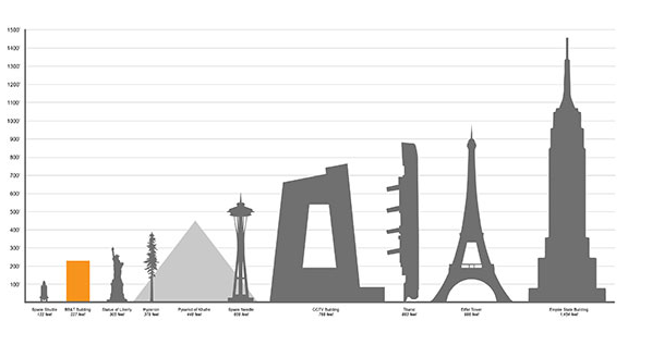 The graphic above depicts the BB&T building (orange) measured up against some more famous structures and objects. From left to right : Space Shuttle Atlantis (Florida), Statue of Liberty (New York), Hyperion (California, the tallest living tree in the world), Pyramid of Khafre (Egypt), Seattle Space Needle (Seattle), CCTV Building (China), Titanic (Atlantic Ocean), Eiffel Tower (Paris), and the Empire State Building (New York).